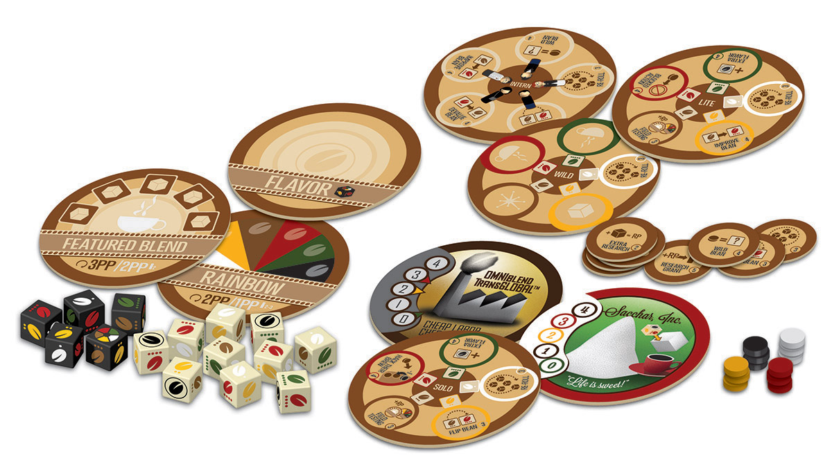 Also as in VivaJava, VivaJava Dice has players making the crucial decision between blending beans and research, but with a quick, new twist. Players must now use the dice in their pool to blend – using the beans to create a best-seller for quick points, and then whether to press their luck in subsequent rounds for bigger points but less dice as the blends degrade – or to research, and use their valuable beans to gain an ever-changing variety of dice-manipulating abilities, new ways to score, and paths that lead to aiding a competitor for a later payoff or hindering that competitor for immediate gratification. VivaJava Dice also offers a unique system of cooperative dice-rolling that can help you rise to the top, but at the price of someone else riding your coattails.
