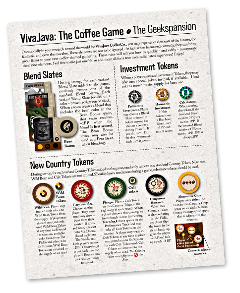 The VivaJava Geekspansion was a special promotional expansion offered to Kickstarter backers during the VivaJava crowdfunding campaign. Although the Geekspansion isn’t available for retail sale, Dice Hate Me Games will be offering this special expansion in the future through giveaways on dicehateme.com, on Boardgamegeek and at conventions, like Origins 2013.